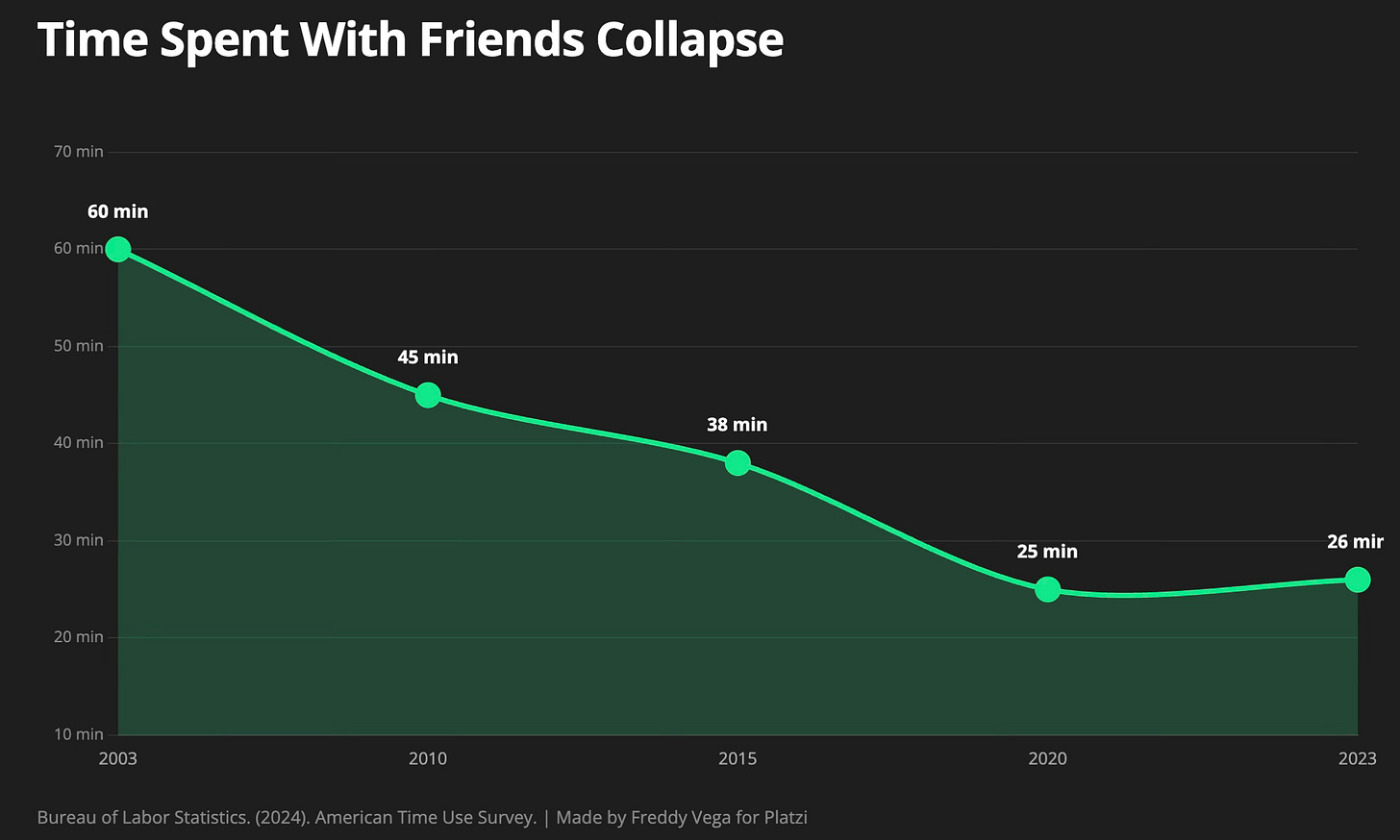 There’s been a collapse in time spent with friends. In 2003, people spent about 60 minutes a day with friends. Today? 26 minutes.