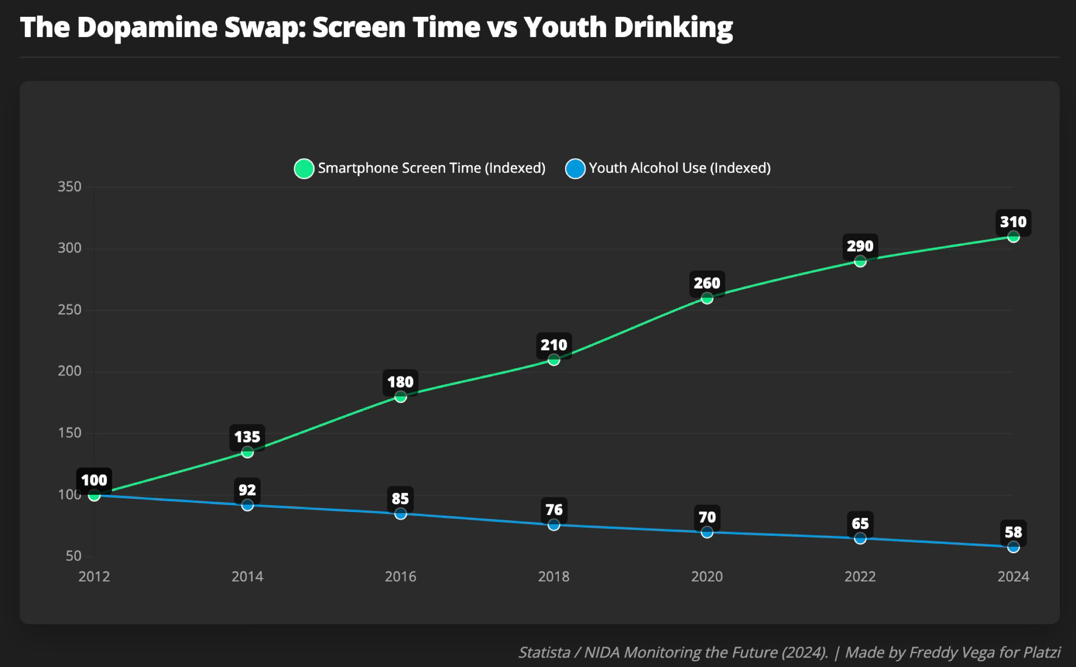 On top of everything, screens are consuming us. When you index 2012 as 100% and track forward, you see youth alcohol use declining while screen time grows at an almost exponential rate.