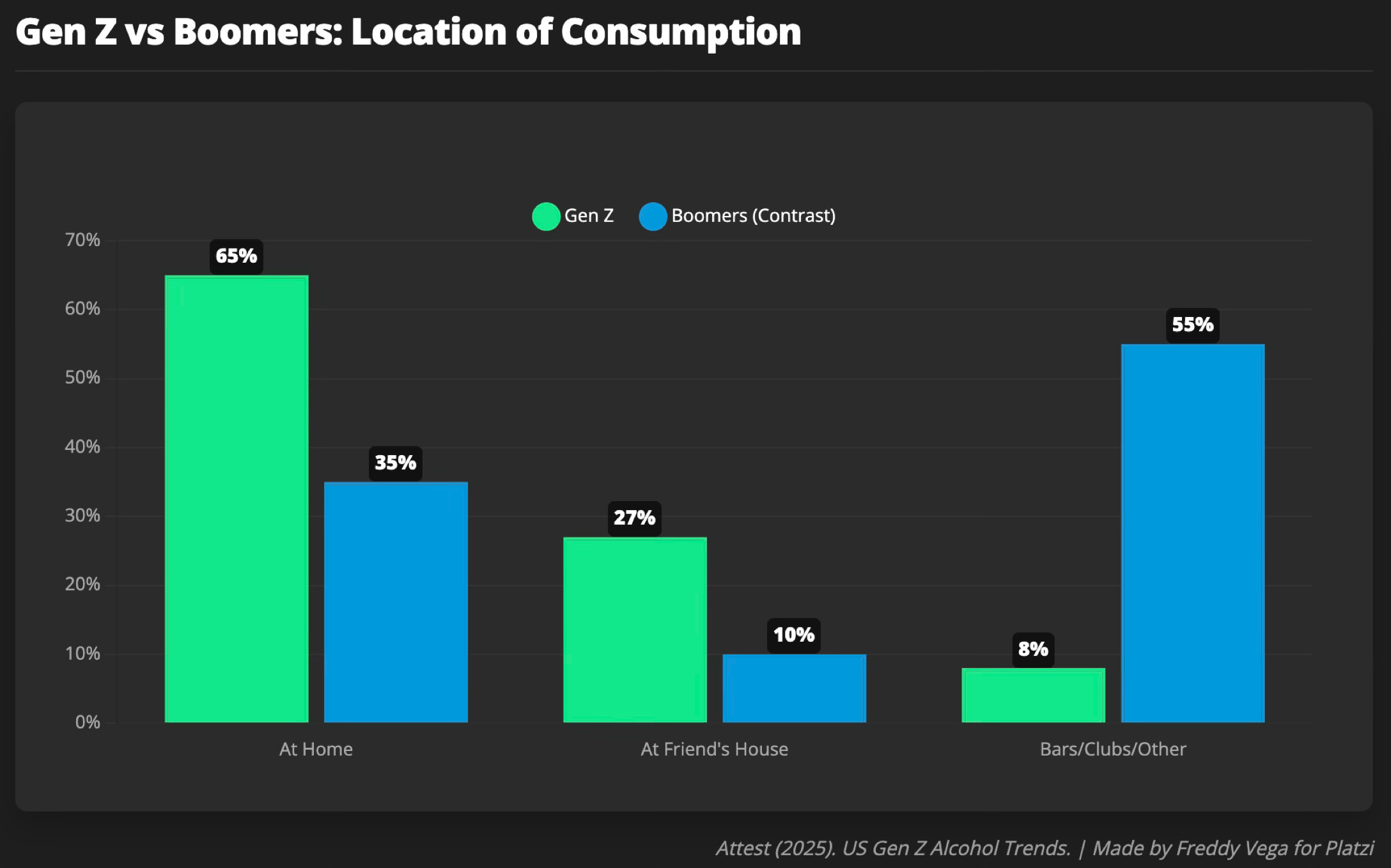 Look at where people consume. When you compare Gen Z (under 24) with Boomers, Gen Z predominantly drinks at home (like alcoholics) while Boomers predominantly drank in clubs, bars, social venues. They left the house.
