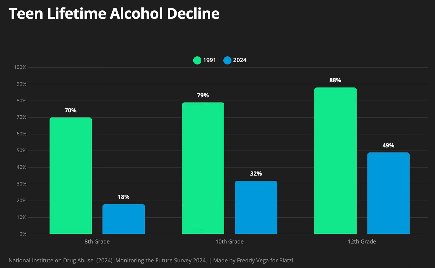 When you break down teen alcohol consumption by grade level: in the 90s, 70% of eighth graders had tried alcohol. By 2024? Just 18%. For tenth graders, it went from 79% to 32%. For seniors, from 88% to 49%.