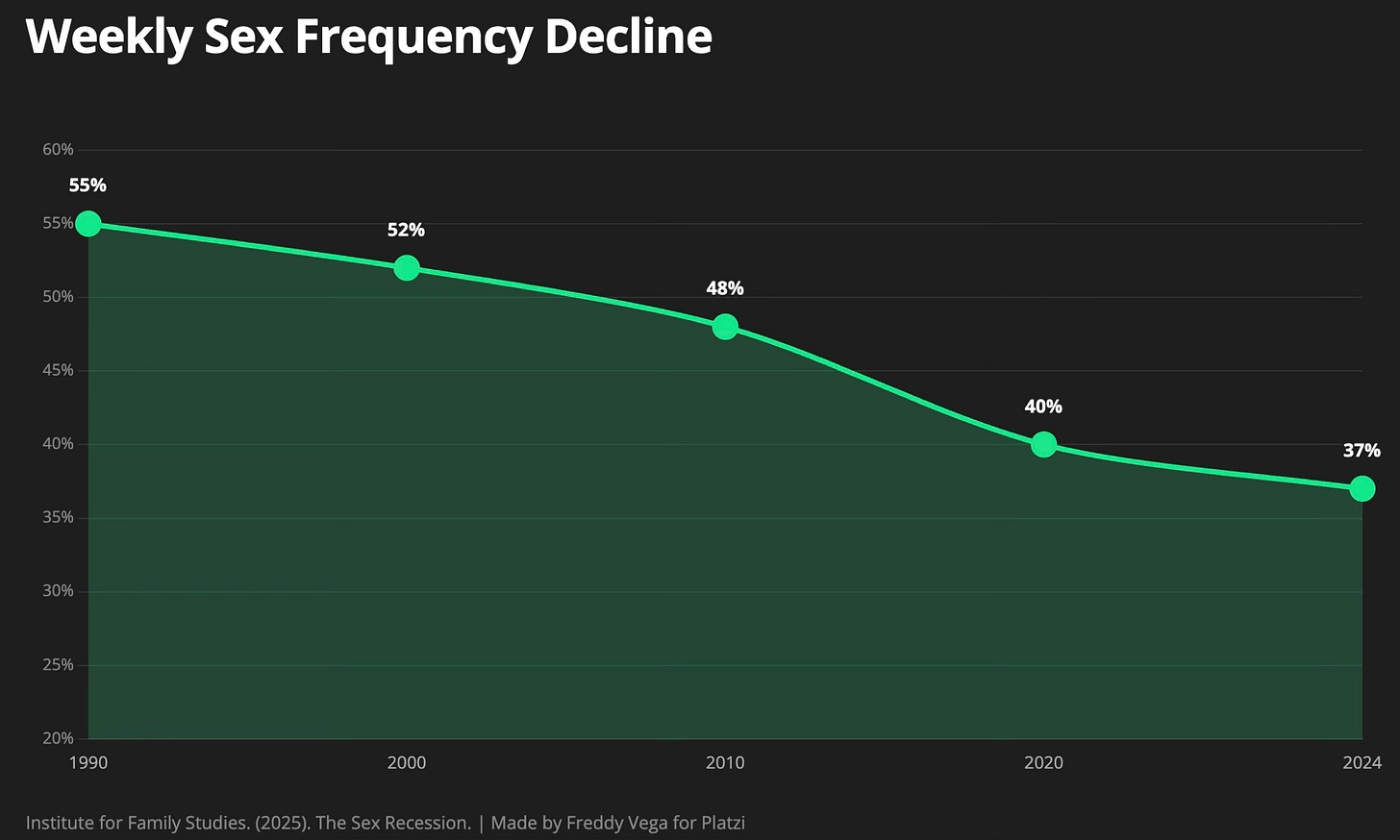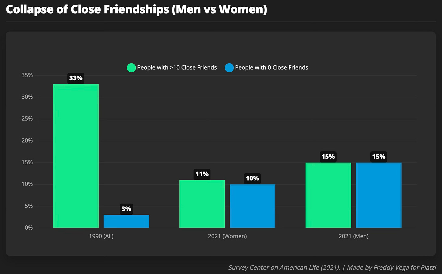 And it’s not just romantic connection, close friendships collapsed too. In the 90s, 33% of people had more than 10 friends. Only 3% had zero friends. Today, 10% of women and 15% of men live in absolute solitude.