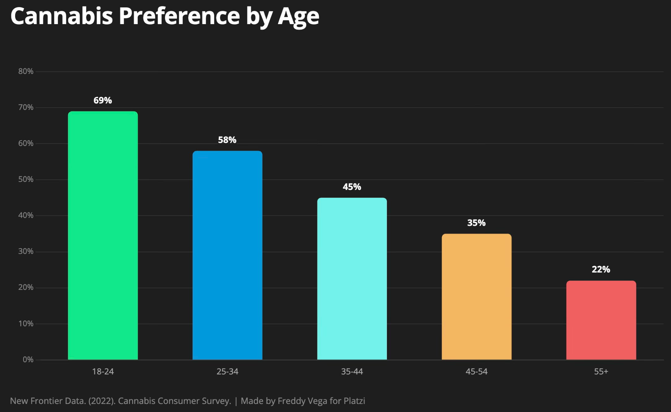 This also tracks generationally. The heaviest cannabis consumers are Gen Z (18-24), followed by 25-34, then 35-44, and so on. The generational decline in cannabis use mirrors, inversely, the generational decline in alcohol.