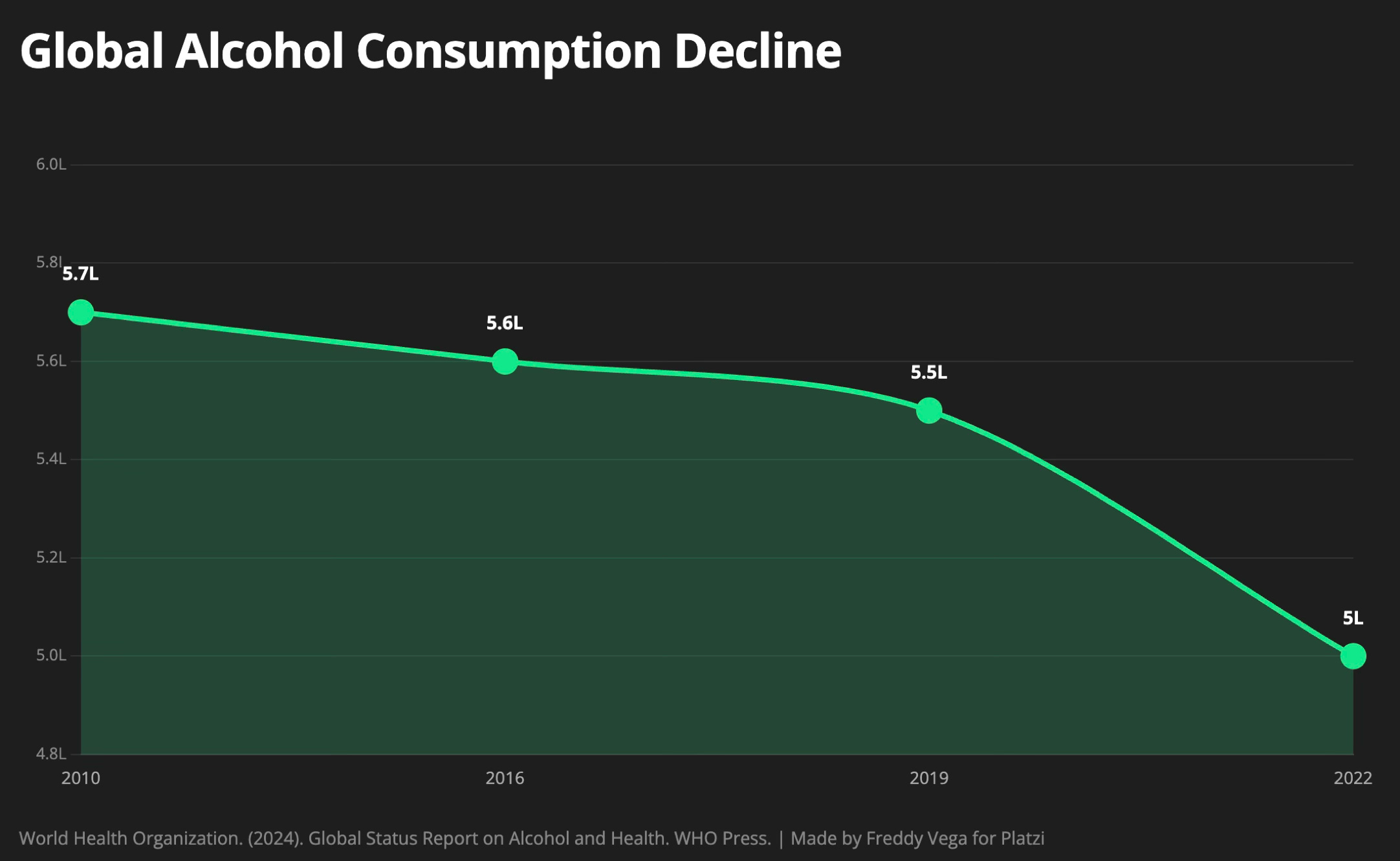 Alcohol consumption is declining globally. Less than half of last year’s high school graduates had ever tried alcohol at any point during their entire high school experience. That number used to be 83% about fifteen years ago.