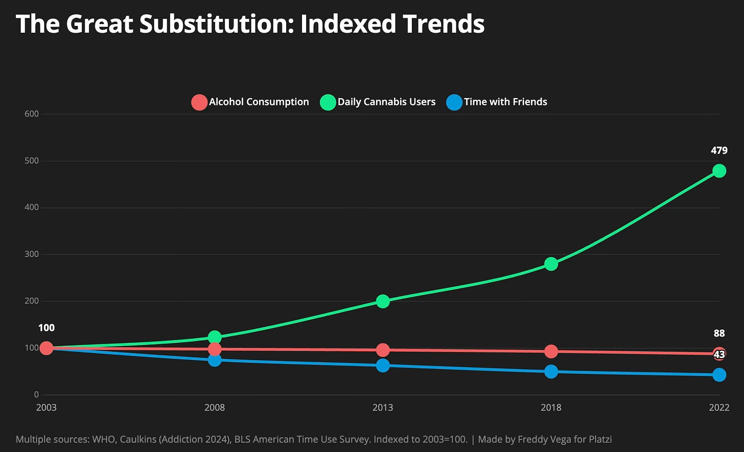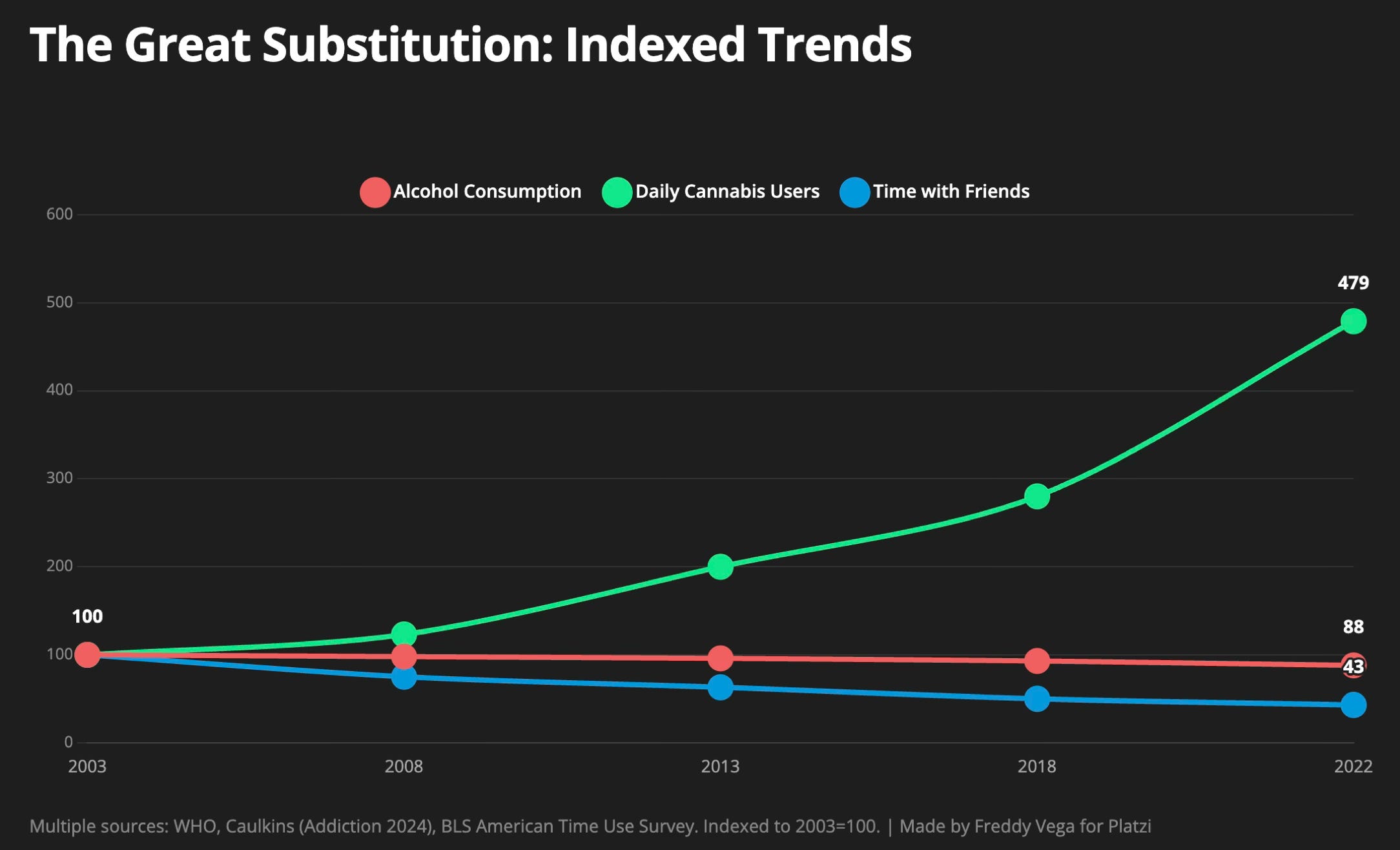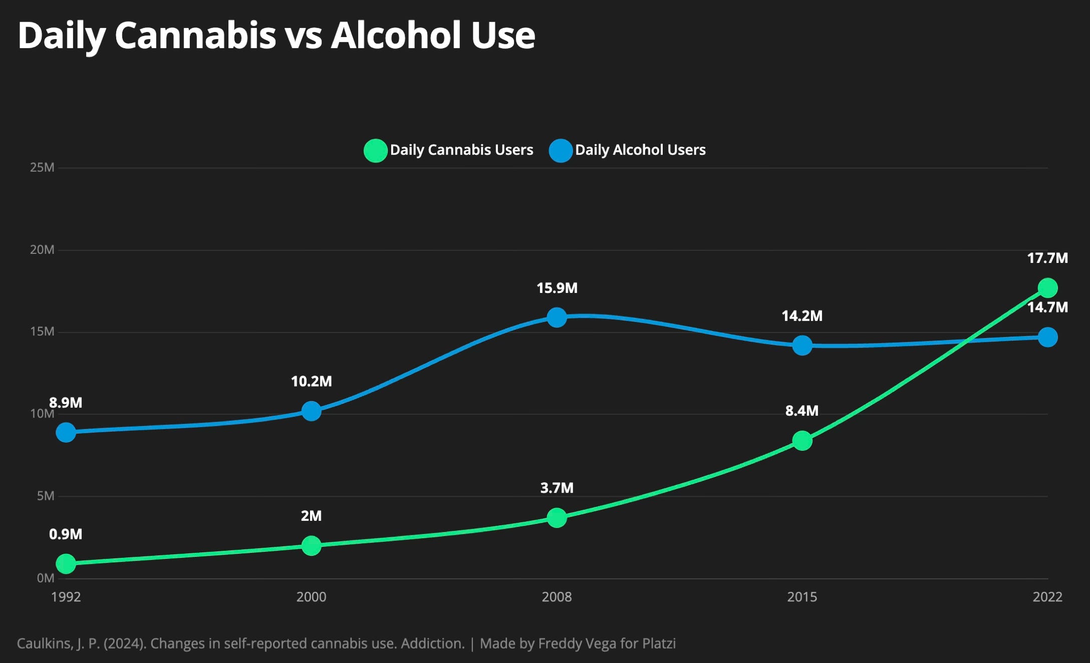 There’s now a crossover point between daily alcohol users and daily cannabis users. Since roughly 2008, driven by legalization, cannabis consumption started rising, and for the first time in history, there are more daily cannabis users than daily alcohol users in the United States.