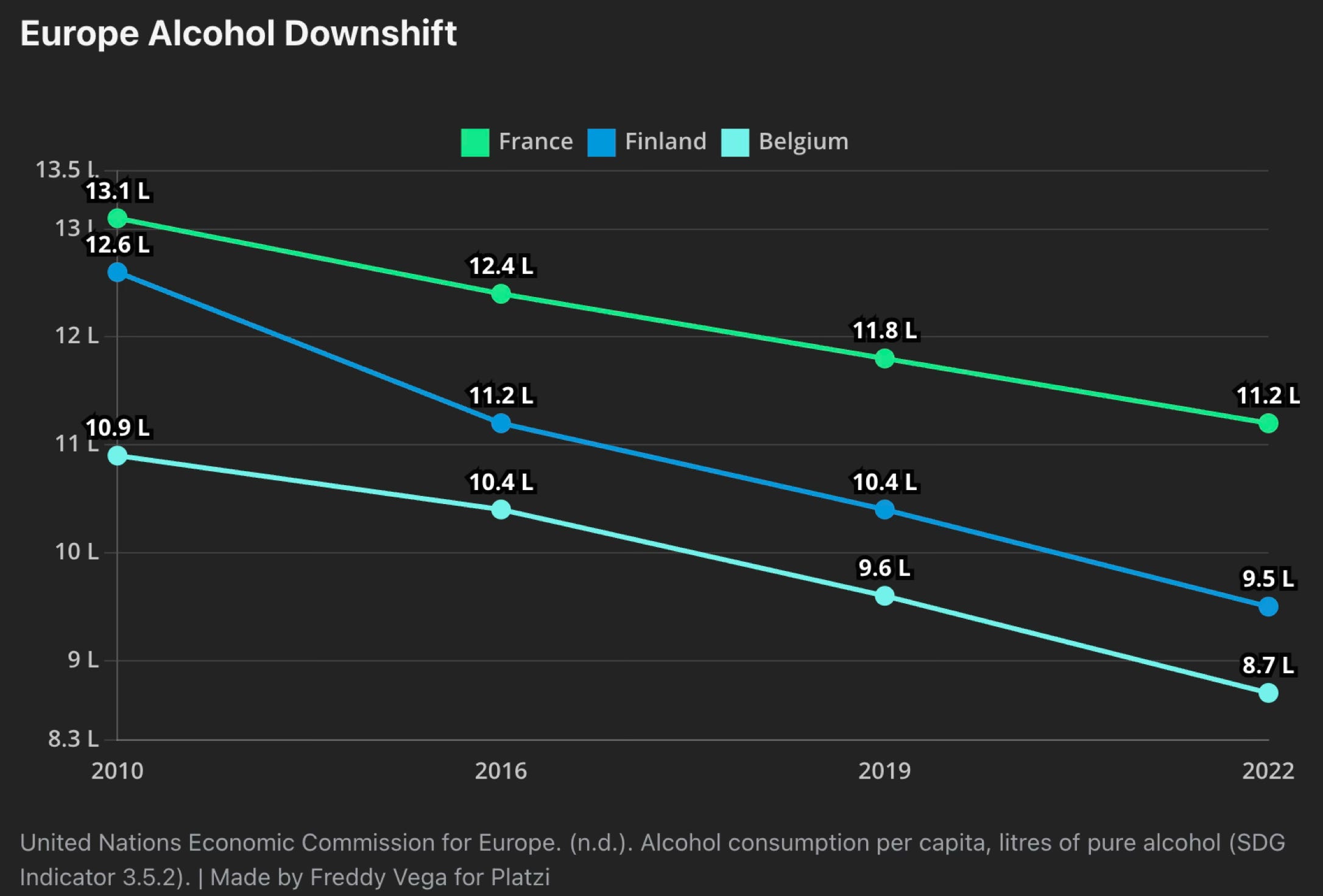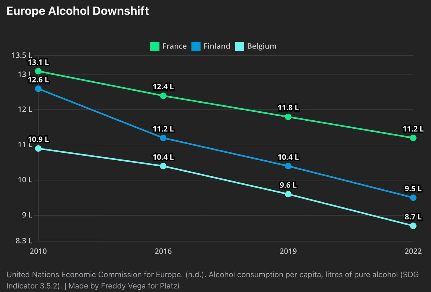 Even in Europe, historic wine producers and cultural drinkers, alcohol is in free fall. From 2010 to 2022, consumption in France, Finland, and Belgium has dropped significantly.