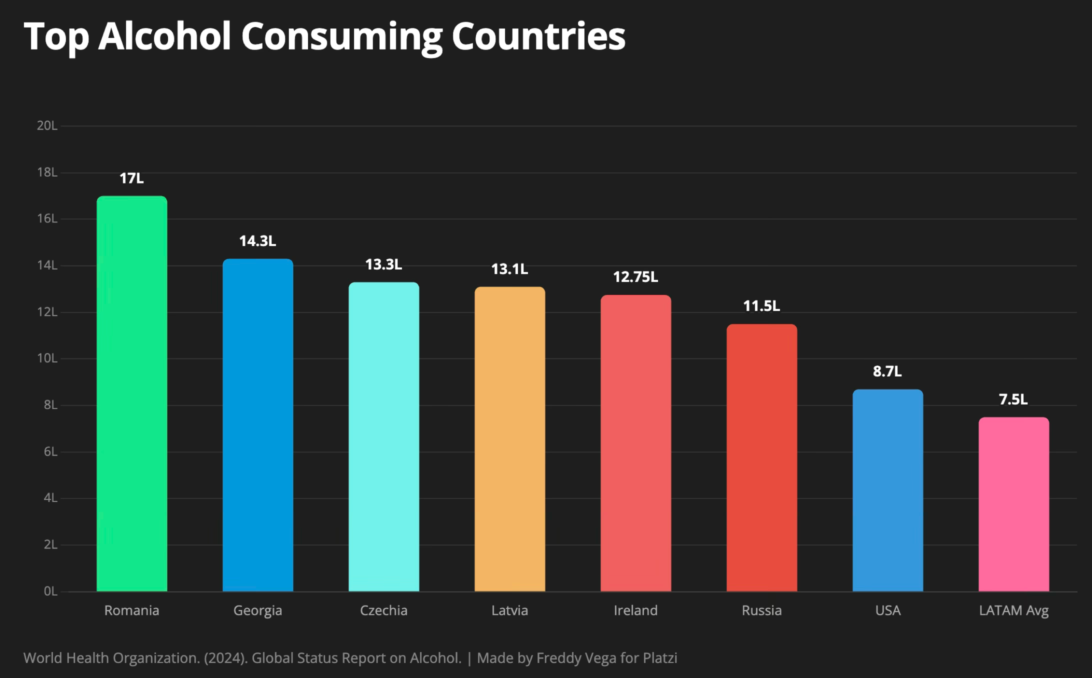 And before you say “but here in Latin America we drink a ton”, not really. Latin America is actually well below the top consuming countries. The heaviest drinkers are Romania, Georgia (more than double Latin America’s average), Czech Republic, Latvia, Ireland, Russia. The US drinks more than Latin America.