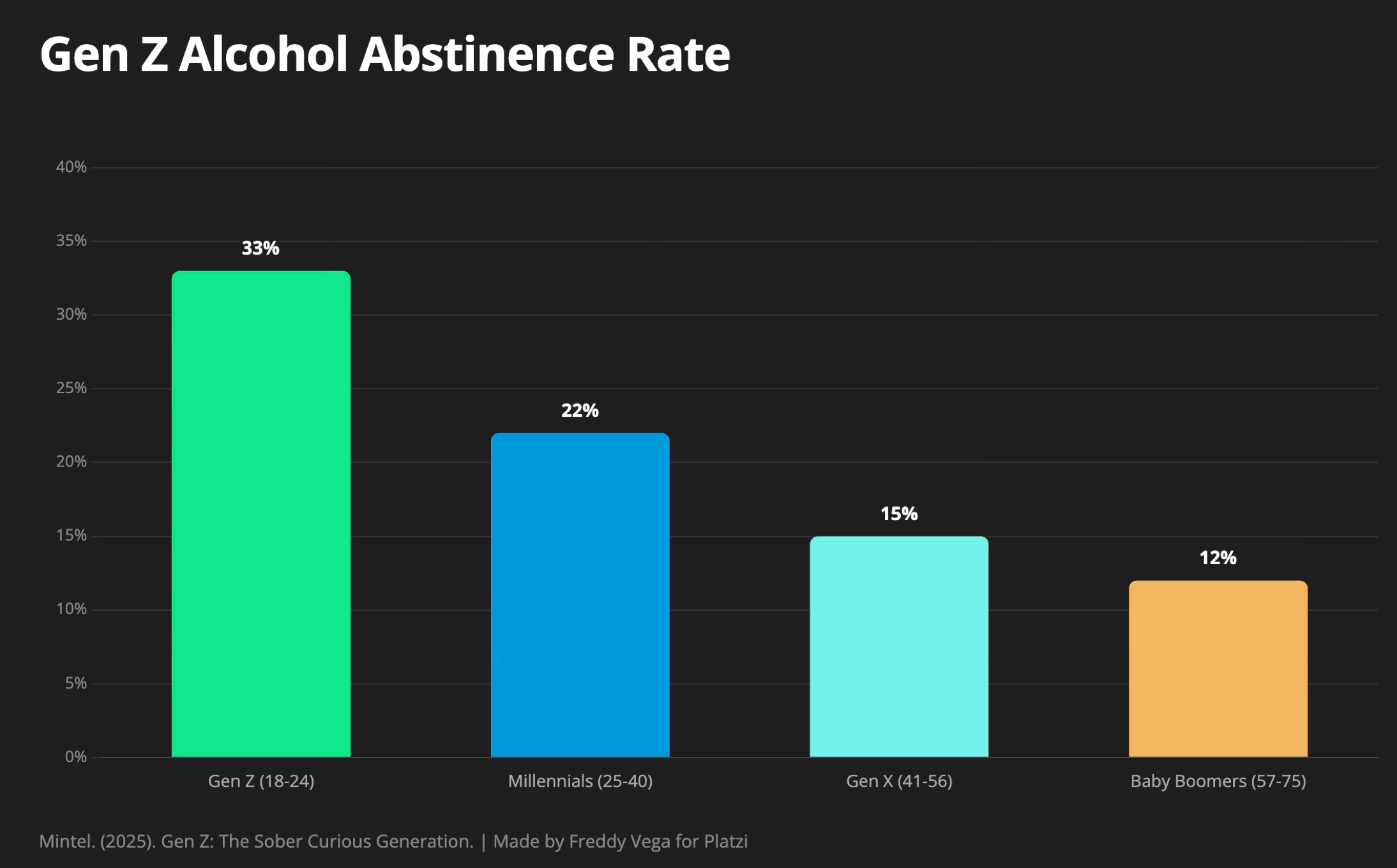 A third of people aged 18-24 don’t consume alcohol at all, compared to 22% of millennials, 15% of Gen X, and 12% of boomers. Boomers drink at brutal rates.