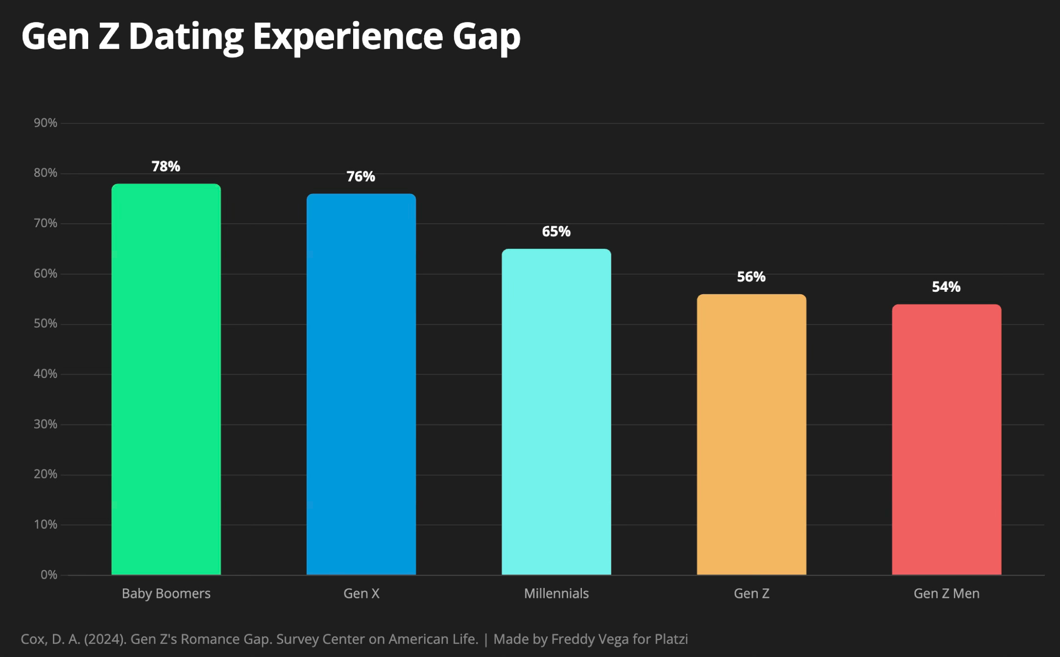 Look at this wild chart: Half of Gen Z have never had a boyfriend or girlfriend before reaching adulthood. In contrast, 78% of Boomers, 76% of Gen X and 65% of Millennials reached this human milestone.